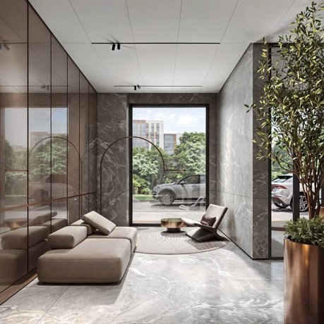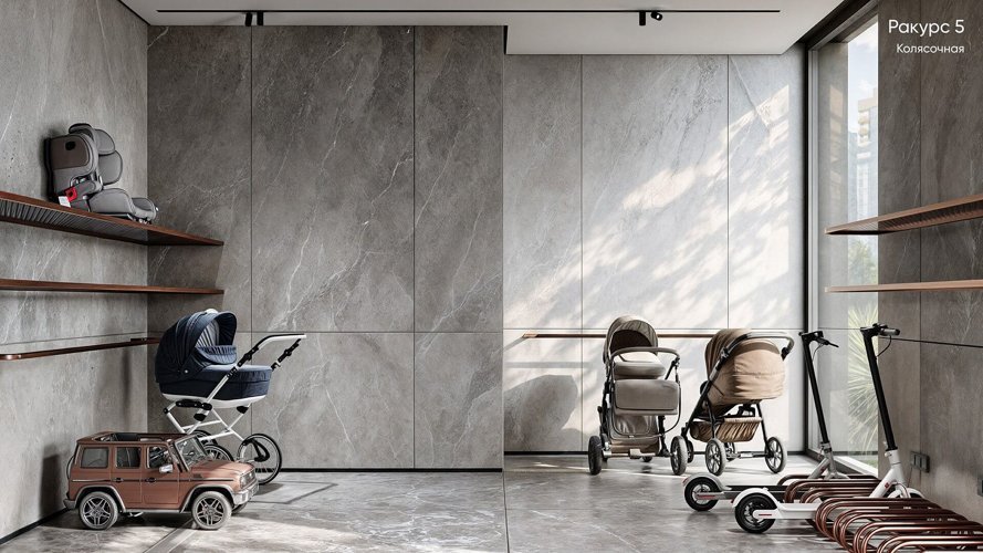 Стены и пол выполнены из широкоформатного керамогранита благородных оттенков. Колясочные и кладовые дают свободу личного и квартирного пространства.