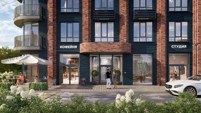 Проектом предусмотрена концепция торговой улицы на первых этажах дома, где будут располагаться аптека, кафе, супермаркет, салон красоты и стоматологический кабинет, чтобы все необходимое было на расстоянии лифта.